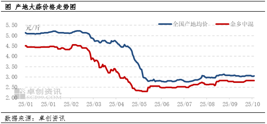 综上所述:受持续降雨影响,北方蒜区大蒜种植时间被迫延后,导致市场看涨预期逐渐形成。叠加双节备货需求提振,产地大蒜市场价格上涨。10月中下旬,大蒜完成种植之前,市场供需关系或保持紧平衡状态,价格走势大概率延续强势格局,金乡本地中混级价格预计2.85-2.95元/斤。