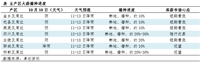 2025年自9月下旬起,北方蒜产区持续降雨,恰逢进入秋播大蒜播种阶段,受到土壤湿度较大的原因,机械化运行受限,秋播大蒜集中播种时间向后推迟。据卓创资讯(301299)了解,当下大蒜主产区除少数沙土地外,大部分地块土壤湿度较大,大蒜种植难以进行。金乡产区除马集附近区域外,完成播种的地块屈指可数。邳州、邯郸区域大蒜播种进度相对其他产地稍快,集中播种时间较去年同期相比预计推迟1-2个节气。