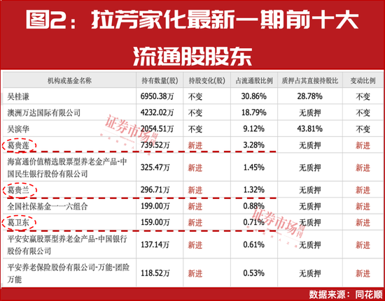 值得一提的是,葛卫东、葛贵莲和葛贵兰对部分个股完成了联合重仓,如品牌化妆品公司拉芳家化,即获得了三人的联合重仓。其中,葛贵莲持股数量最高,持股规模最大,位列拉芳家化的第四大流通股股东,葛贵兰和葛卫东则分别位列第六大和第八大流通股股东(见图2)。此外,葛卫东和葛贵莲还联合重仓了黄酒公司会稽山。