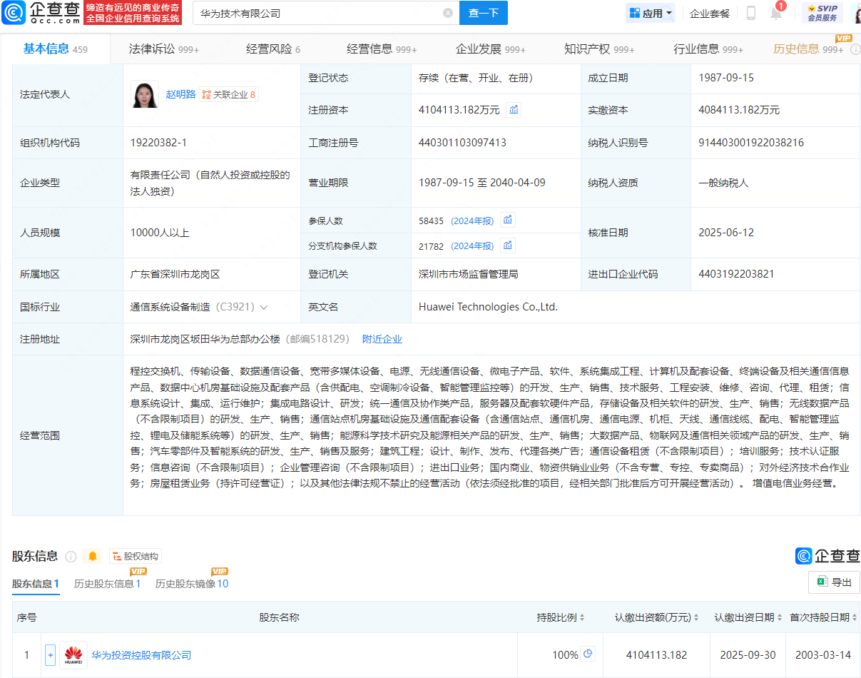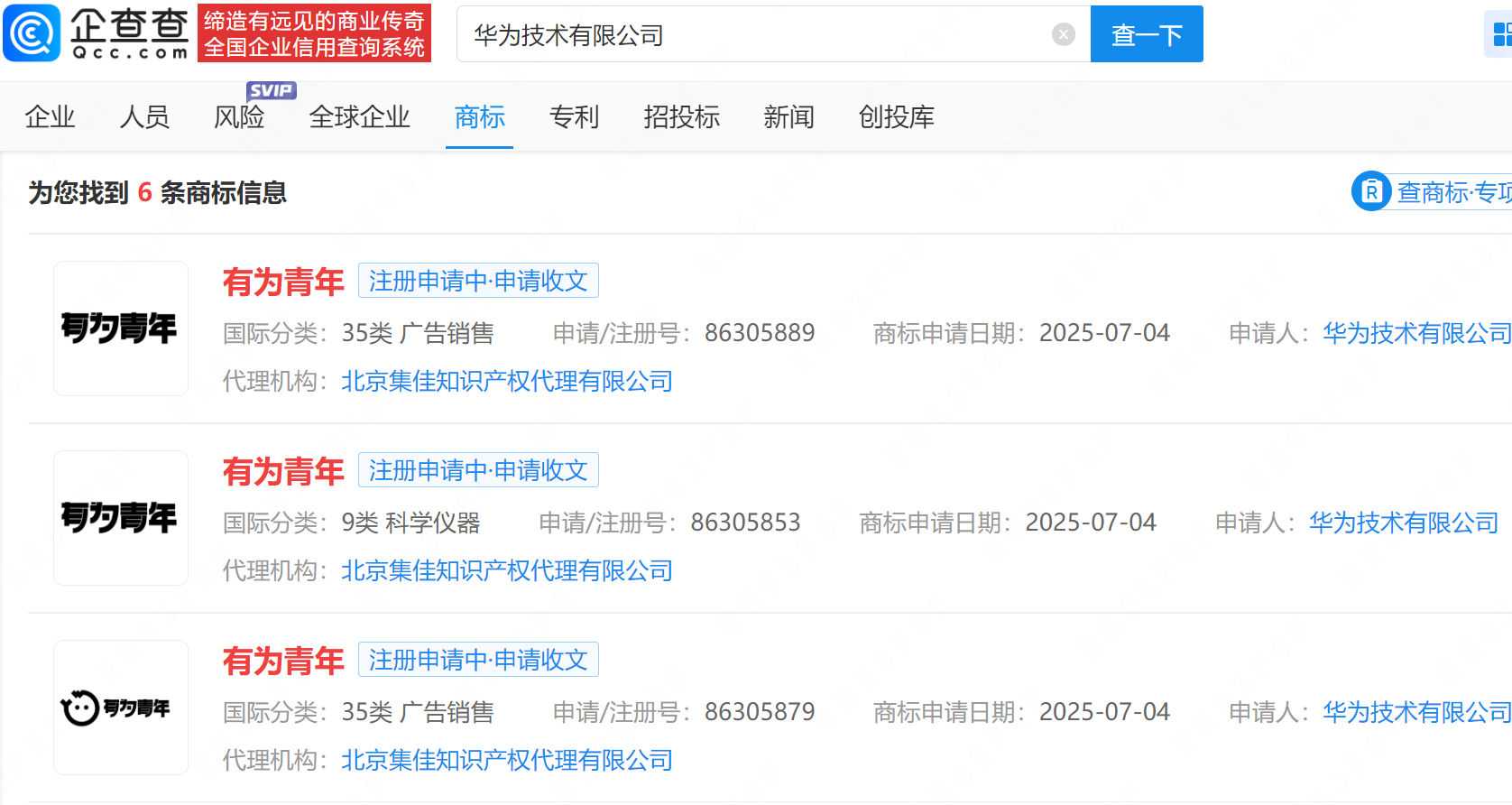 近期,华为技术有限公司申请注册3枚“有为青年”商标,国际分类为科学仪器、广告销售,当前商标状态为注册申请中。企查查信息显示,华为技术有限公司成立于1987年9月,法定代表人为赵明路,注册资本约410.4亿人民币,由华为投资控股有限公司全资持股。